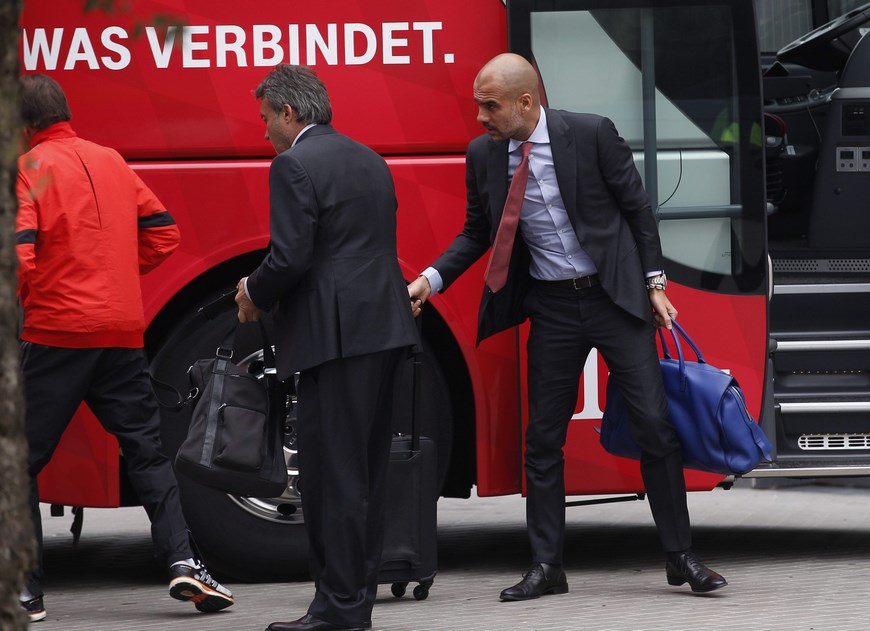 El entrenador del Bayern de Múnich, Pep Guardiola (d), a su llegada al hotel de concentración en la víspera del partido de ida de la semifinal de la Liga de Campeones que le enfrentará mañana al Barça en el Camp Nou. EFE/Alejandro García