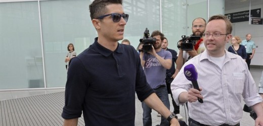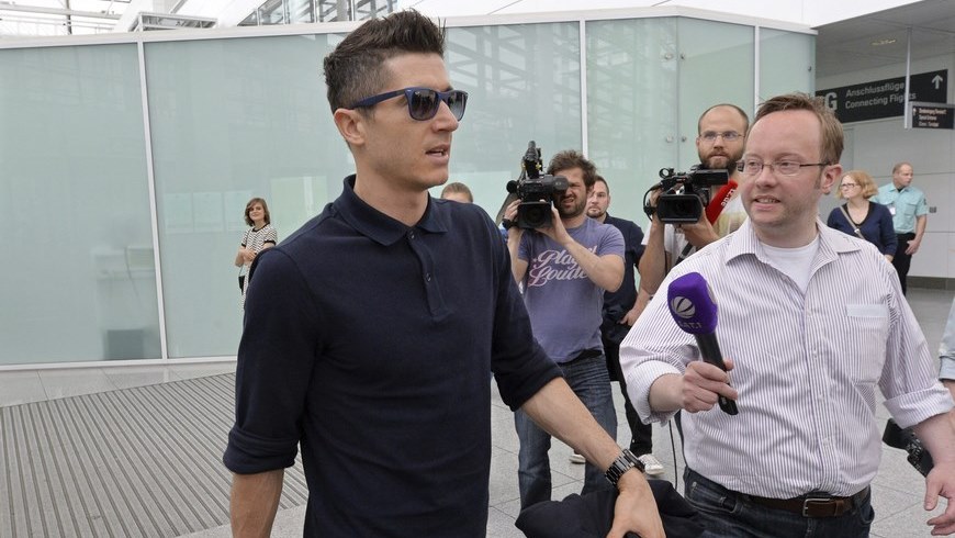 El delantero polaco del FC Bayern Múnich Robert Lewandowski (izq) en el aeropuerto de Múnich (Alemania) este martes 5 de mayo de 2015 antes de partir a Barcelona. El equipo se enfrenta mañana al FC Barcelona en el partido de ida de la semifinal de la Liga de Campeones. EFE