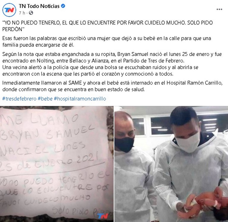 Cuando las autoridades llegaron al lugar y lo inspeccionaron, se encontraron con una desgarradora imagen, un bebé recién nacido había sido abandonado con una triste nota: “Me llamo Bryan Samuel, nací el lunes 25 de enero de 2021. Yo no puedo tenerlo, el que lo encuentre por favor cuídelo mucho. Solo pido perdón”, nota que fue viralizada en redes sociales.