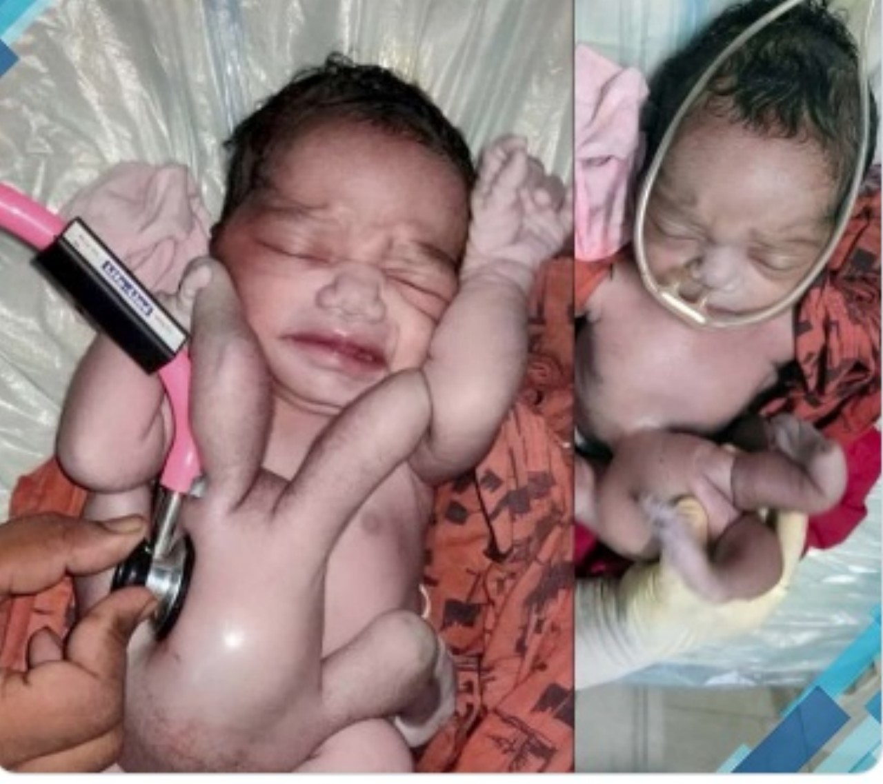 El pequeño de dos kilos y 900 gramos, nació con cuatro extremidades que sobresalen de su estómago. El hecho ocurrió en el Centro de Salud Comunitario Shahabad en Hardoi, al norte de India, de acuerdo al Daily Star.