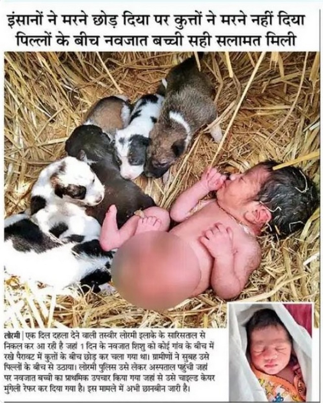 La bebé, a la que decidieron nombrarla Akanksha, fue encontrada junto a varios cachorros y afortunadamente estaba completamente ilesa.