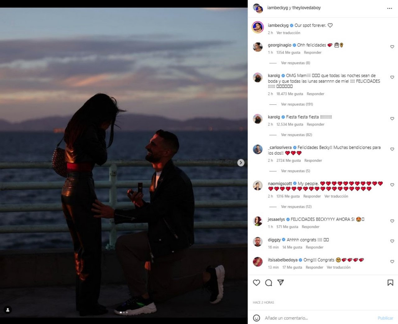 A través de redes sociales cantante Rebbeca Marie Gómez​, más conocida como Becky G, anunció que se comprometió con su novio, el deportista Sebastian Lletger.