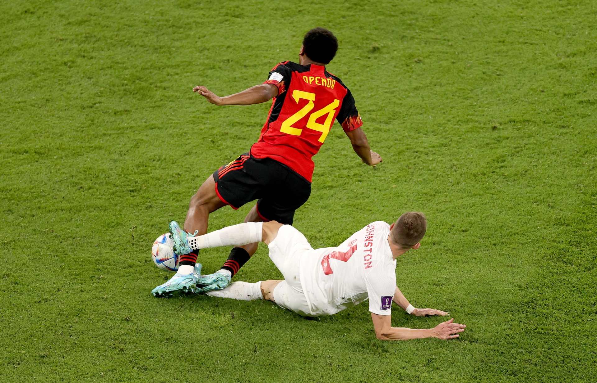 Doha (Qatar), 23/11/2022.- Lois Openda (L) of Belgium is fouled by Alistair Johnston of Canada during the FIFA World Cup 2022 group F soccer match between Belgium and Canada at Ahmad bin Ali Stadium in Doha, Qatar, 23 November 2022. (Mundial de Fútbol, Bélgica, Catar) EFE/EPA/Friedemann Vogel