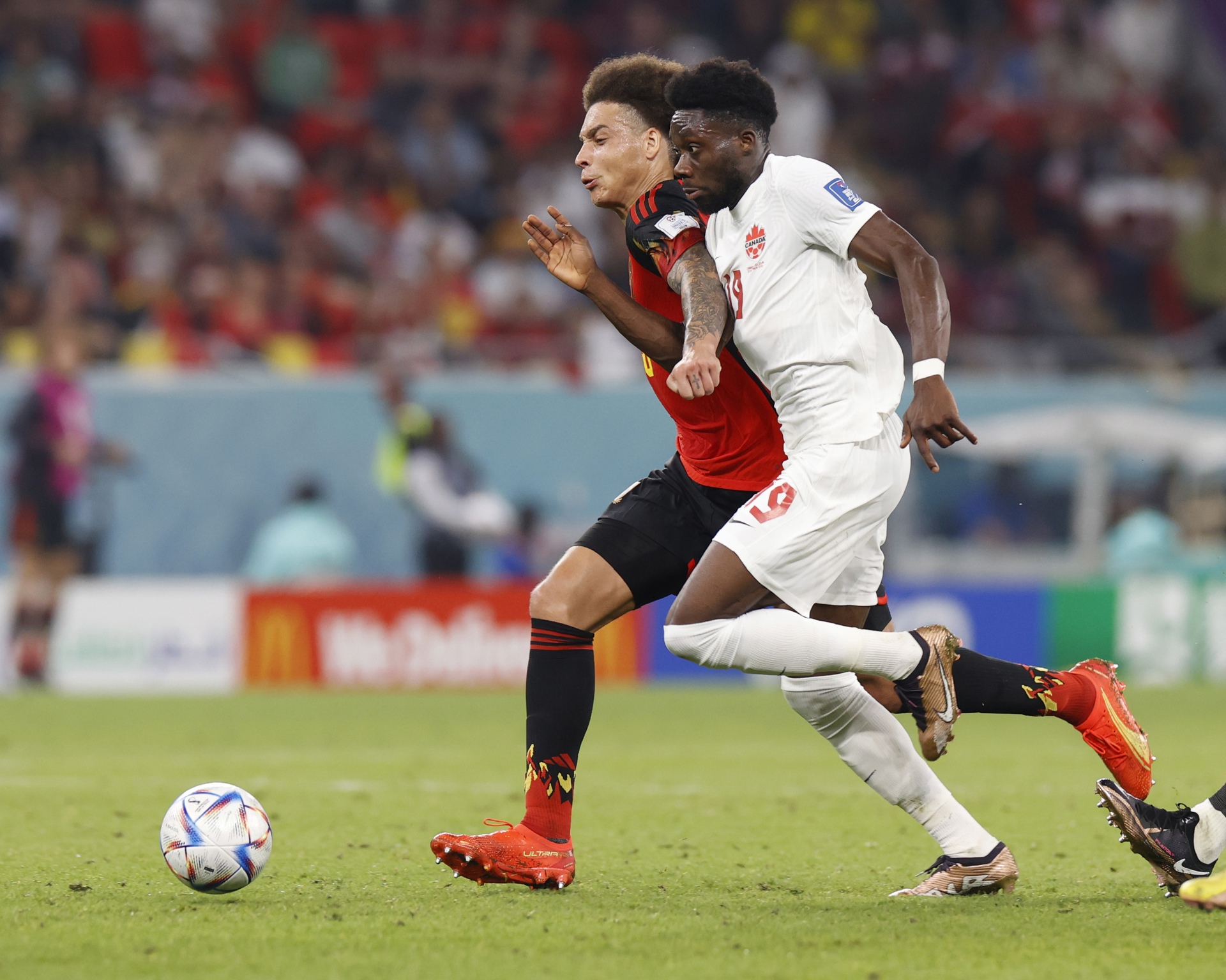 Doha (Qatar), 23/11/2022.- Axel Witsel (L) of Belgium against Alphonso Davies of Canada (R) during the FIFA World Cup 2022 group F soccer match between Belgium and Canada at Ahmad bin Ali Stadium in Doha, Qatar, 23 November 2022. (Mundial de Fútbol, Bélgica, Catar) EFE/EPA/Rungroj Yongrit