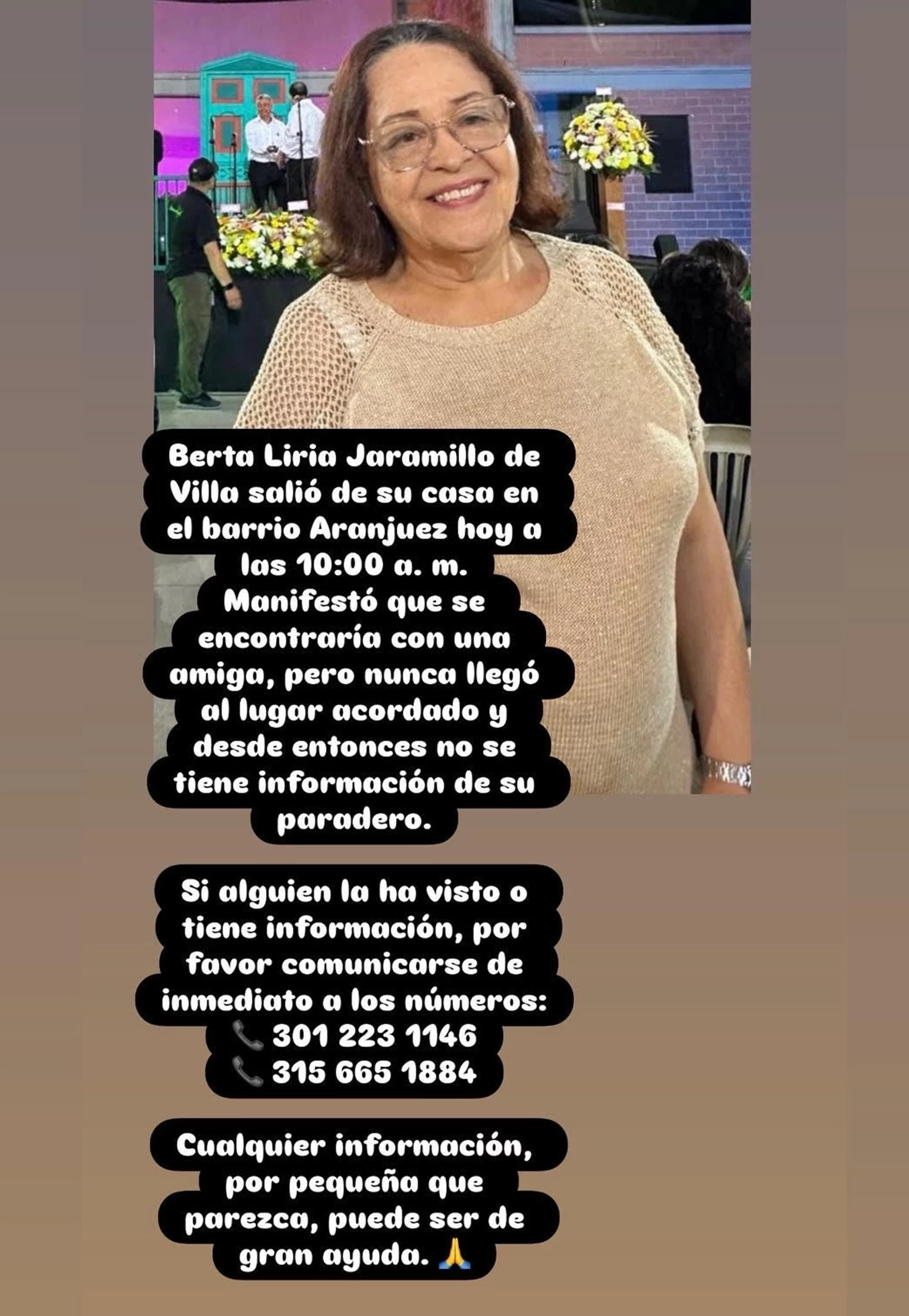 Resumen: Berta Liria Jaramillo de Villa salió de su vivienda ubicada en el barrio Aranjuez hoy a las 10:00 a. m. Antes de salir, informó que se encontraría con una amiga en un lugar previamente acordado.