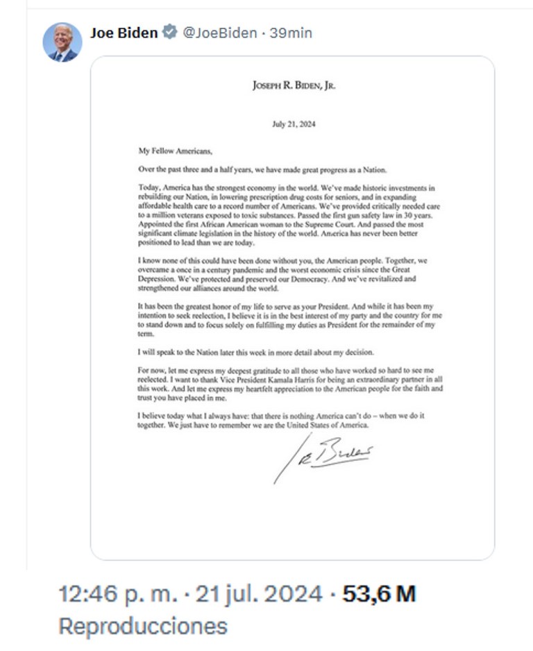 Ante esta situación Biden ha publicado una carta en sus perfiles oficiales, al medio día de este domingo 21 de julio: