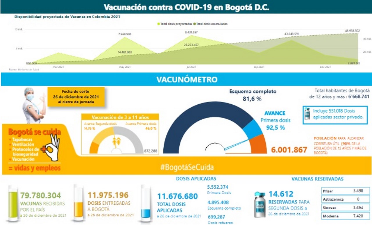 Lo anterior significa que el 81.6 % de la población bogotana ya cuenta con el esquema completo de vacunación, mientras que el 92.5 % tiene la primera dosis del biológico.