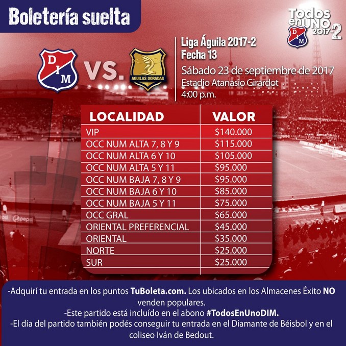 Independiente Medellín puso a la venta la boletería para el partido de la fecha 13 de la Liga Águila II-2017 ante Rionegro Águilas, que se cumplirá el próximo sábado en el Atanasio Girardot.