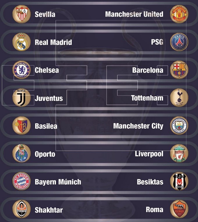 Real Madrid-París Saint Germain y Chelsea-Barcelona son los dos grandes enfrentamientos de los octavos de final de la Liga de Campeones, según el sorteo celebrado este lunes en la sede de la UEFA en Nyon.