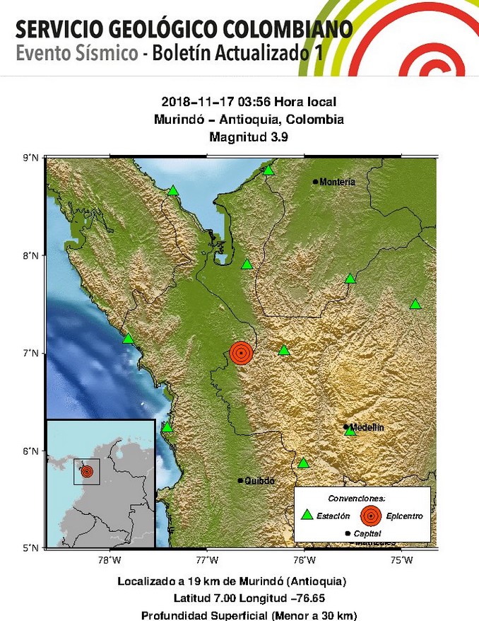Minuto30.com- Las autoridades llevan a cabo las respectivas verificaciones en el municipio de Murindó, Urabá, luego de registrarse un sismo en horas de la madrugada de 4.0 grados de intensidad en la escala de Richter.