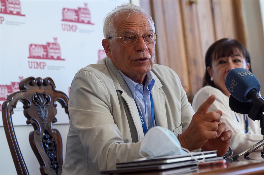 Borrell ha compartido este miércoles una rueda de prensa con la vicepresidenta primera del Senado, Cristina Narbona, y el secretario de Estado para la Unión Europea, Juan González-Barba, con motivo del curso que dirige en la Universidad Internacional Menéndez Pelayo (UIMP) de Santander sobre el futuro de la Unión Europea tras la crisis de la COVID-19.