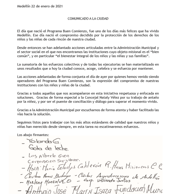 Según lo expresaron en una misiva, “las acciones adelantadas de forma conjunta el día de ayer por quienes hemos venido siendo operadores del Programa Buen Comienzo, son la expresión del compromiso de nuestras instituciones con los niños y niñas de la ciudad”.