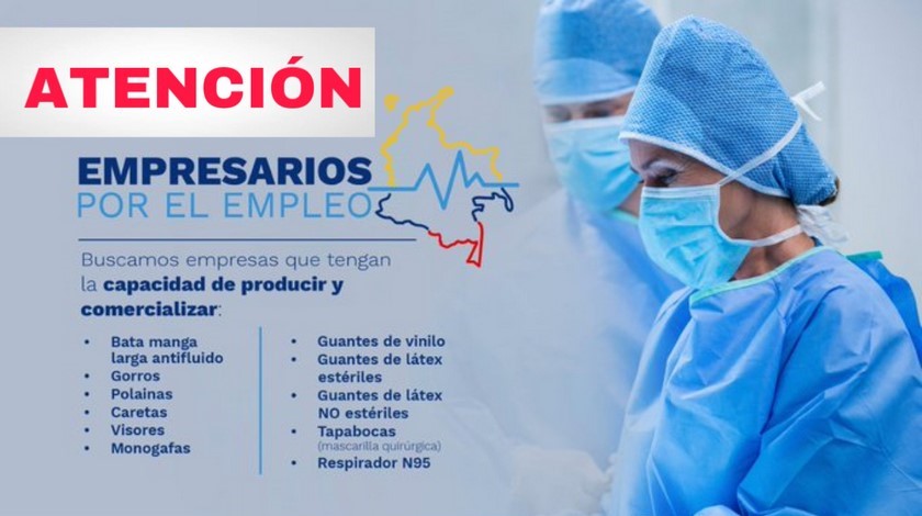 El Gobierno Nacional invita al sector productivo para que participe en “Empresarios por empleo”, la convocatoria que busca identificar la oferta disponible de las micro, pequeñas, medianas y grandes empresas que producen y/o comercializan elementos de protección para el sector salud, esenciales para la atención del COVID-19.