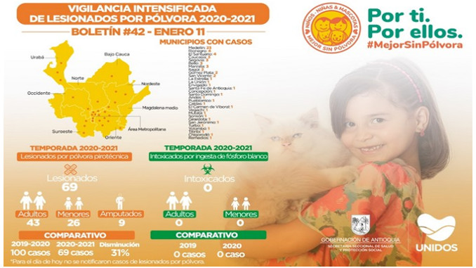 Según el reporte entregado en las últimas horas por la Secretaría Seccional de Salud de Antioquia, hoy, 11 de enero, no se reportaron lesionados por pólvora en el departamento.