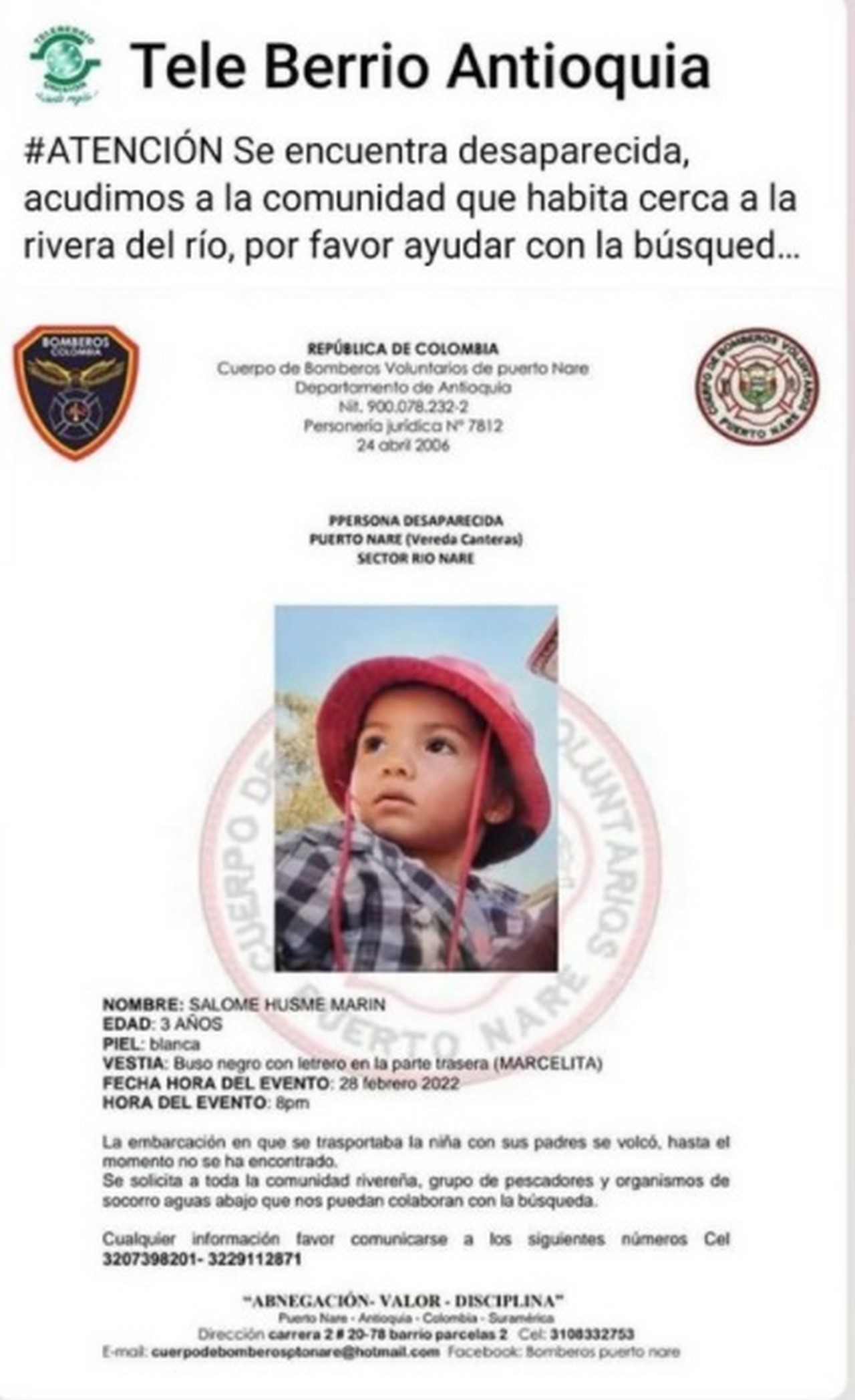 El Cuerpo de Bomberos de Puerto Nare reportó la pérdida de una niña identificada como Salomé de 4 años de edad quien, al parecer, cayó al río Nare en horas de la noche del pasado lunes, 28 de febrero, cuando iba con sus padres en una embarcación que se volcó.