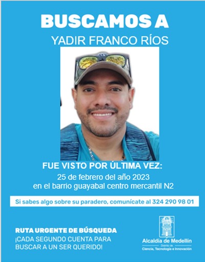 Yadir labora en la parte técnica de un programa de televisión en un canal local de Medellín y fue visto por última vez en el barrio Guayabal, Centro Mercantil N2, la mañana del sábado.