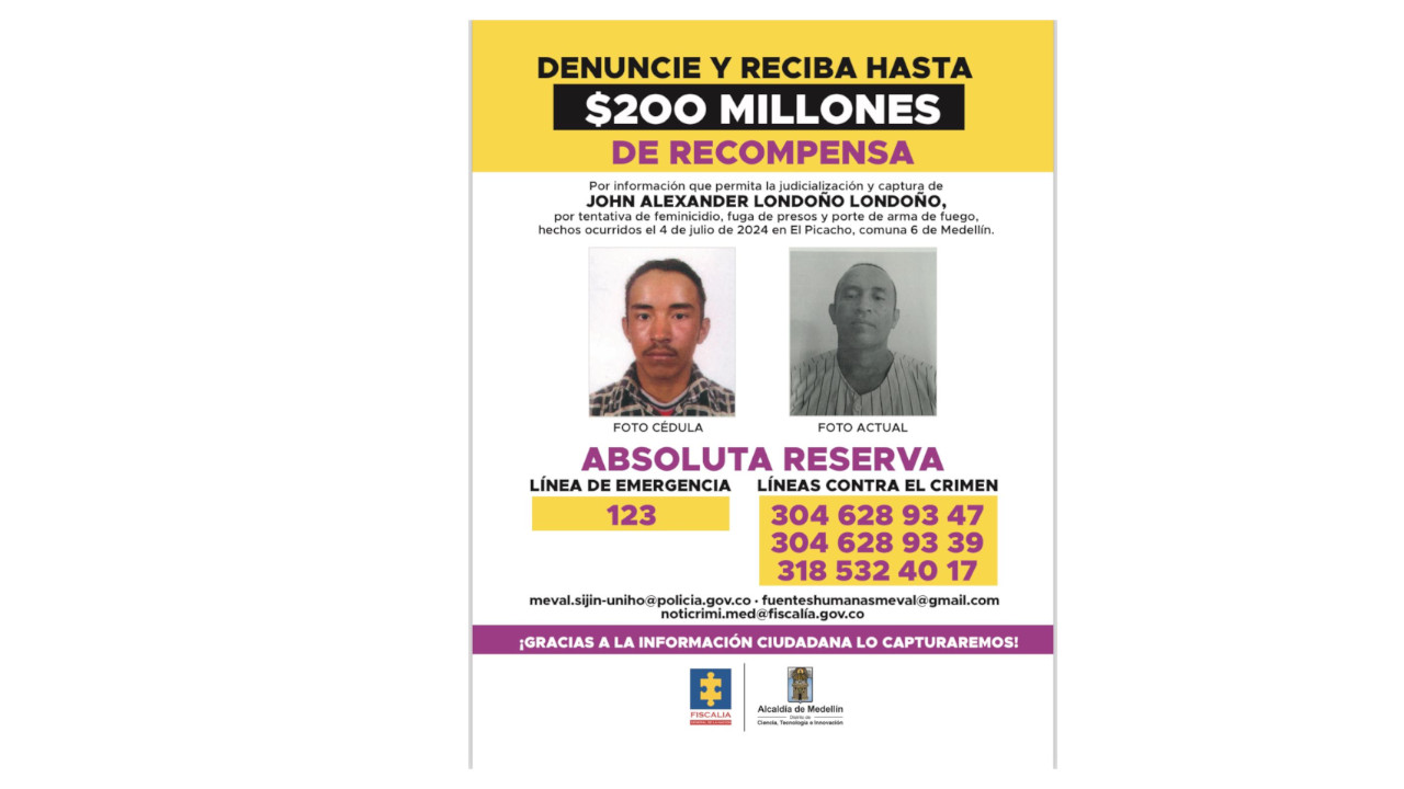 Resumen: En la mañana de este viernes 12 de julio, las autoridades ofrecieron una recompensa de hasta $200 millones por información que conduzca a la captura de Jhon Alexander Londoño, quien presuntamente asesinó a su ex pareja sentimental, Shenaly Camila Suárez, en el barrio Doce de Octubre de Medellín. Londoño habría cometido el crimen poco después de ser beneficiado con casa por cárcel.