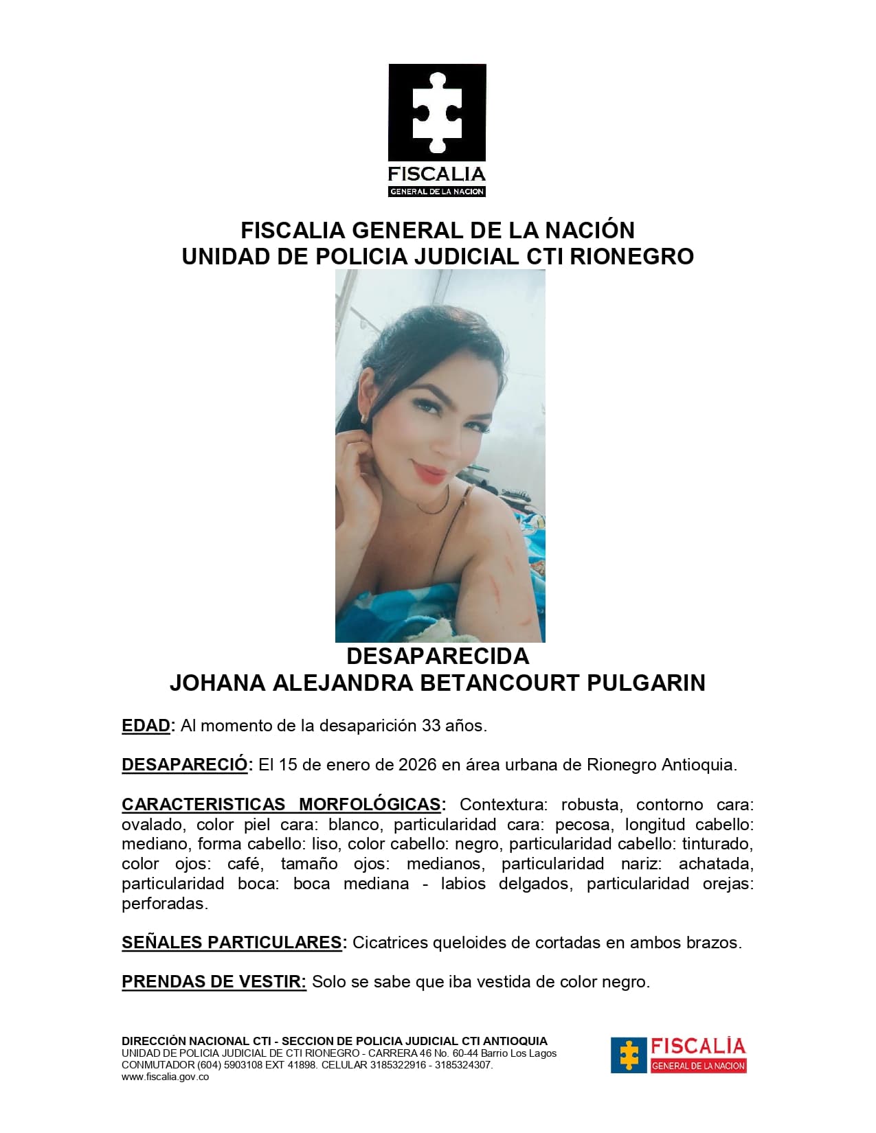 Minuto30.com .- Familiares de Johana Alejandra Betancourt Pulgarín se encuentran angustiados tras perder el rastro de la mujer el pasado jueves 15 de enero de 2026. Johana, de 33 años de edad, fue vista por última vez en el área urbana del municipio de Rionegro, Antioquia.