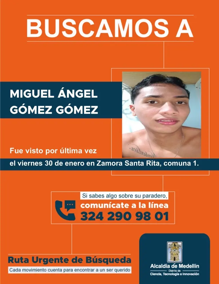 Minuto30.com .- La familia de Miguel Ángel Gómez Gómez se encuentra en una búsqueda desesperada tras perder su rastro en el nororiente de Medellín. El joven fue visto por última vez el pasado viernes 30 de enero en el sector de Santa Rita, ubicado en el barrio Zamora (Comuna 1 de Medellín).