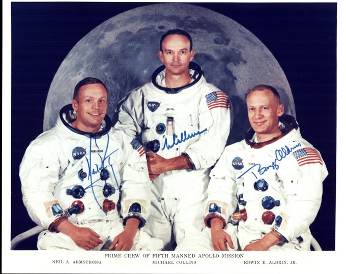 Fotografía oficial cedida por la NASA donde aparecen los astronautas del Apolo 11, el comandante Neil A. Armstrong (i); el piloto del módulo de comando, Michael Collins, y el piloto del módulo lunar, Edwin E. Aldrin Jr. (d). Medio siglo después del inicio de la histórica misión Apolo 11, un viaje de ida y vuelta a la luna con tres astronautas a bordo, la hazaña será conmemorada mañana con distintas actividades en el Centro Espacial Kennedy de Cabo Cañaveral (Florida, EE.UU.), donde estarán dos de sus protagonistas. EFE/NASA