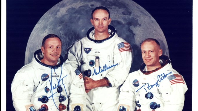 Fotografía oficial cedida por la NASA donde aparecen los astronautas del Apolo 11, el comandante Neil A. Armstrong (i); el piloto del módulo de comando, Michael Collins, y el piloto del módulo lunar, Edwin E. Aldrin Jr. (d). Medio siglo después del inicio de la histórica misión Apolo 11, un viaje de ida y vuelta a la luna con tres astronautas a bordo, la hazaña será conmemorada mañana con distintas actividades en el Centro Espacial Kennedy de Cabo Cañaveral (Florida, EE.UU.), donde estarán dos de sus protagonistas. EFE/NASA