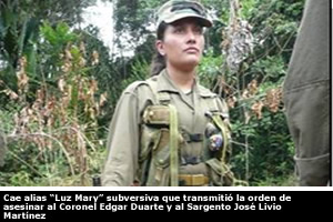 En cumplimiento de las instrucciones impartidas por el presidente Juan Manuel Santos para avanzar en la consecución de resultados contra las Farc, a fin de debilitar sus estructuras y contener las intenciones terroristas indiscriminadas contra la población civil, la Dirección Antisecuestro y Antiextorsión en coordinación con Inteligencia del Ejército Nacional asestó en las últimas horas un importante golpe a la guerrilla con la captura de Alias “luz mary”.