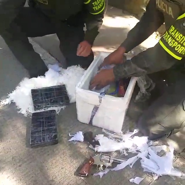 Indicó además que los uniformados hallaron una nevera de icopor que escondía en varias envolturas plásticas, 4 armas de fuego tipo revolver, 900 cartuchos 9mm para pistola, 100 cartuchos 38 mm para revolver y 1000 gramos de Clorhidrato de Cocaína, los cuales eran transportados en un vehículo tipo camioneta de servicio público.