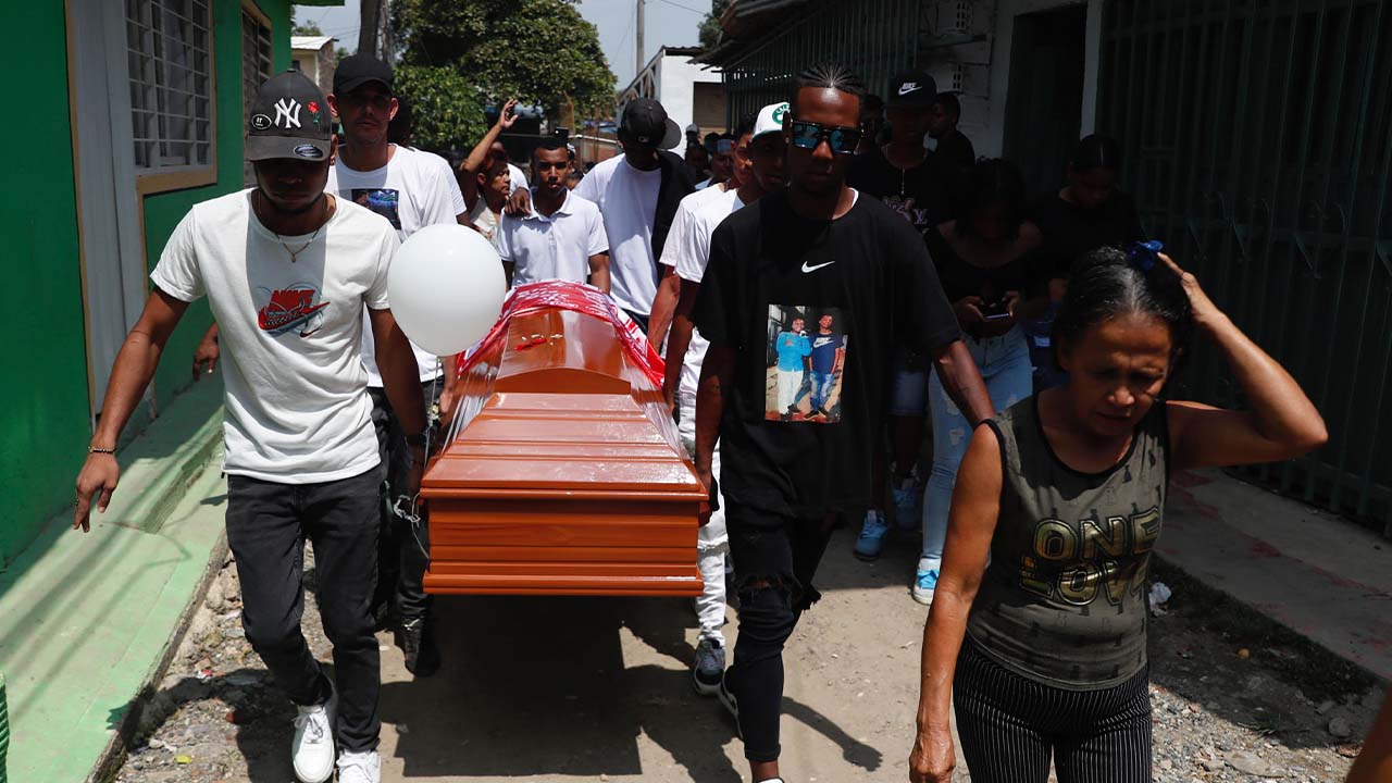 Familiares y amigos de Pablo Andrés Carabalí, hermano de la defensa titular de la selección colombiana femenina de fútbol Jorelyn Carabalí, fueron registrados este miércoles, 16 de agosto, al cargar el féretro del joven asesinado el pasado lunes, en Cali (Colombia). EFE/Ernesto Guzmán