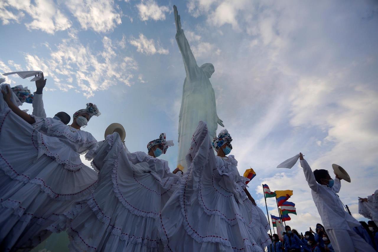Un grupo de danzas folclóricas fue registrado al bailar, durante el acto de presentación de la antorcha de los primeros Juegos Panamericanos Junior 2021, en el tradicional cerro de Cristo Rey, en la ciudad de Cali (Colombia). EFE/Ernesto Guzmán