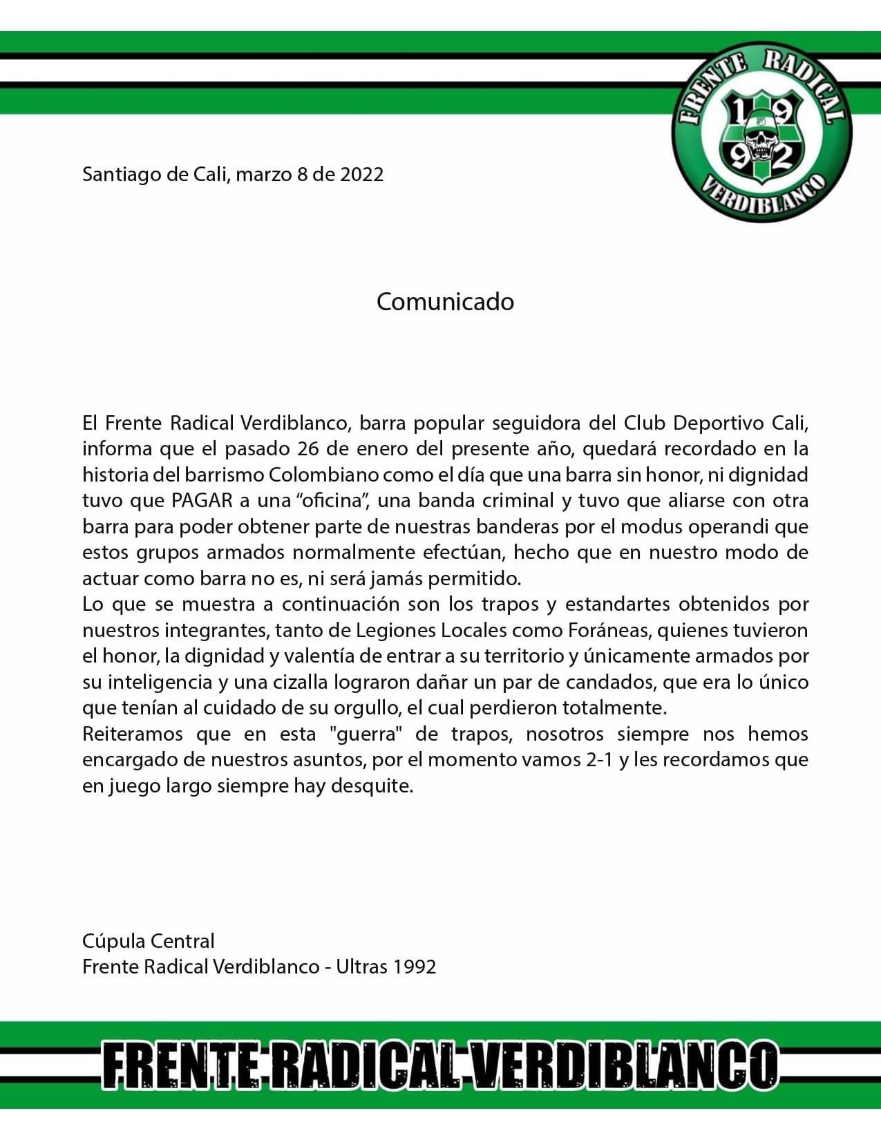 El Frente Radical Verdiblanco, barra popular del Deportivo Cali, publicó en sus redes sociales un comunicado haciendo alusión a un robo que generó la barra del Independiente Medellín a comienzo del año según ellos en conjunto con otra barra popular y una banda armada.