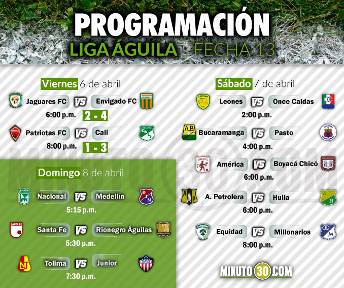 La programación tendrá cinco juegos más este sábado y los tres restantes en la jornada dominical, en la que se destaca el clásico antioqueño 297 entre Atlético Nacional e Independiente Medellín.