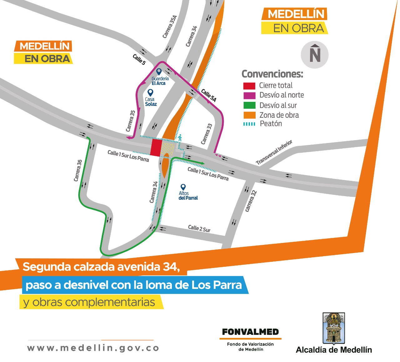 La calle 1 Sur entre las carreras 34 y 35 tendrá cierre total, esto debido a las obras de valorización, específicamente por la ampliación de la avenida 34 con la loma de Los Parra, que alcanza un avance del 49%.