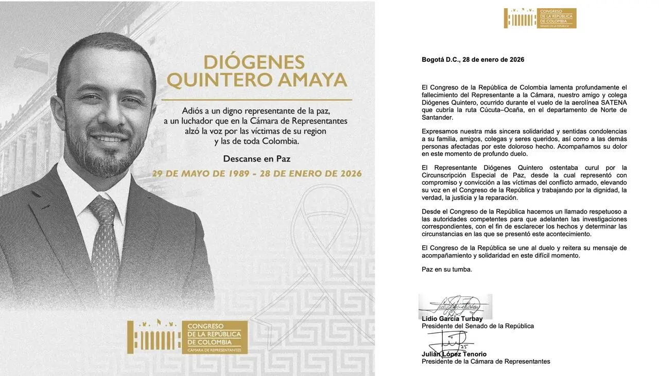 Minuto30.com .- Colombia se estremece ante una nueva tragedia aérea. El representante a la Cámara por las curules de paz, Diógenes Quintero Amaya, es una de las 15 víctimas mortales que dejó el siniestro de una aeronave de la aerolínea Satena ocurrido este miércoles 28 de enero de 2026.
