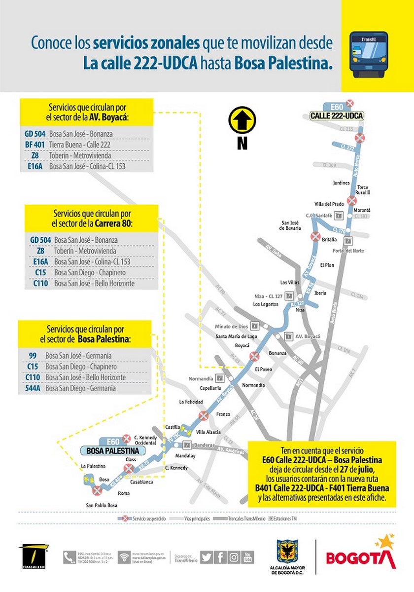 El servicio zonal (buses azules) E60 Calle 222 UDCA – Bosa Palestina, modifica su operación y ahora en sus tablas de recorrido se verá B401- Calle 222 UDCA – F401 Tierra Buena.
