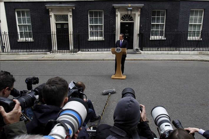 El primer ministro británico, David Cameron, hace una declaración oficial a las puertas de Downing Street, en Londres. EFE
