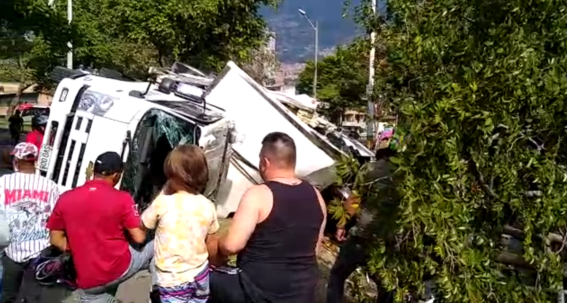 Contra un árbol impactó un camión que terminó volcado a la altura del Puente del Mico de Medellín, en la tarde de este 3 de febrero.