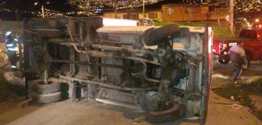 Un pesado camión de placas FCF 492, conducido por Jorge Baez, se volcó por aparente exceso de velocidad, cuando circulaba por la carrera 6C Este con calle 51 sur, localidad de San Cristóbal.
