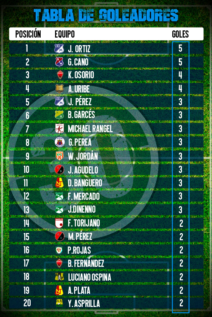 Sin embargo, el delantero argentino de Independiente Medellín, y su similar de Costa Rica, de Millonarios, se mantienen al frente de la tabla de goleadores del campeonato, con cinco anotaciones cada uno.
