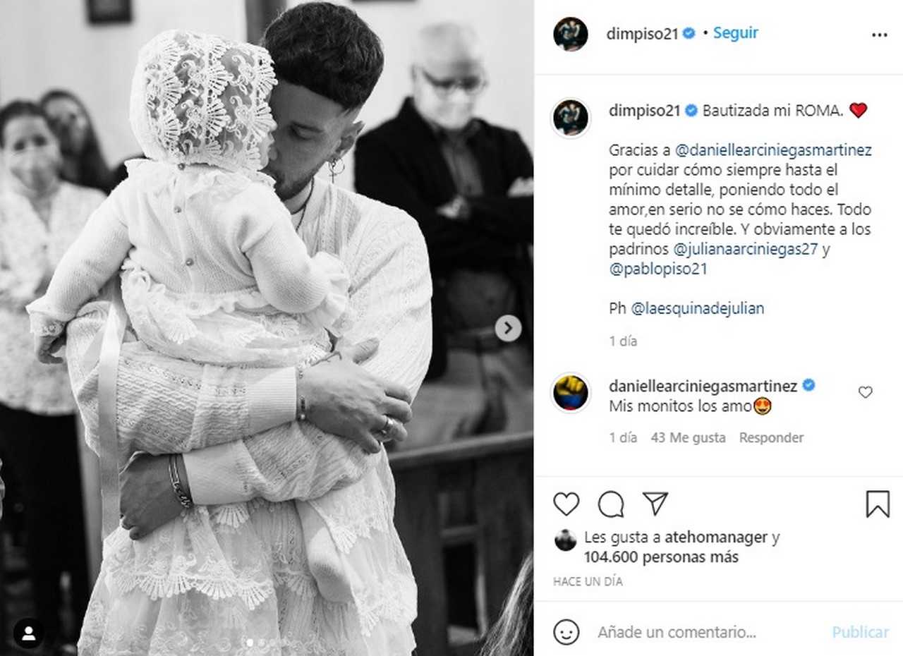 El cantante David Escobar, integrante de la agrupación Piso 21, mostró que ya bautizó a su segunda hija. Su esposa Danielle Arciniegas mostró cómo fue el momento en el que su hija menor, a quien llamaron Roma, recibió el sacramento del bautismo.