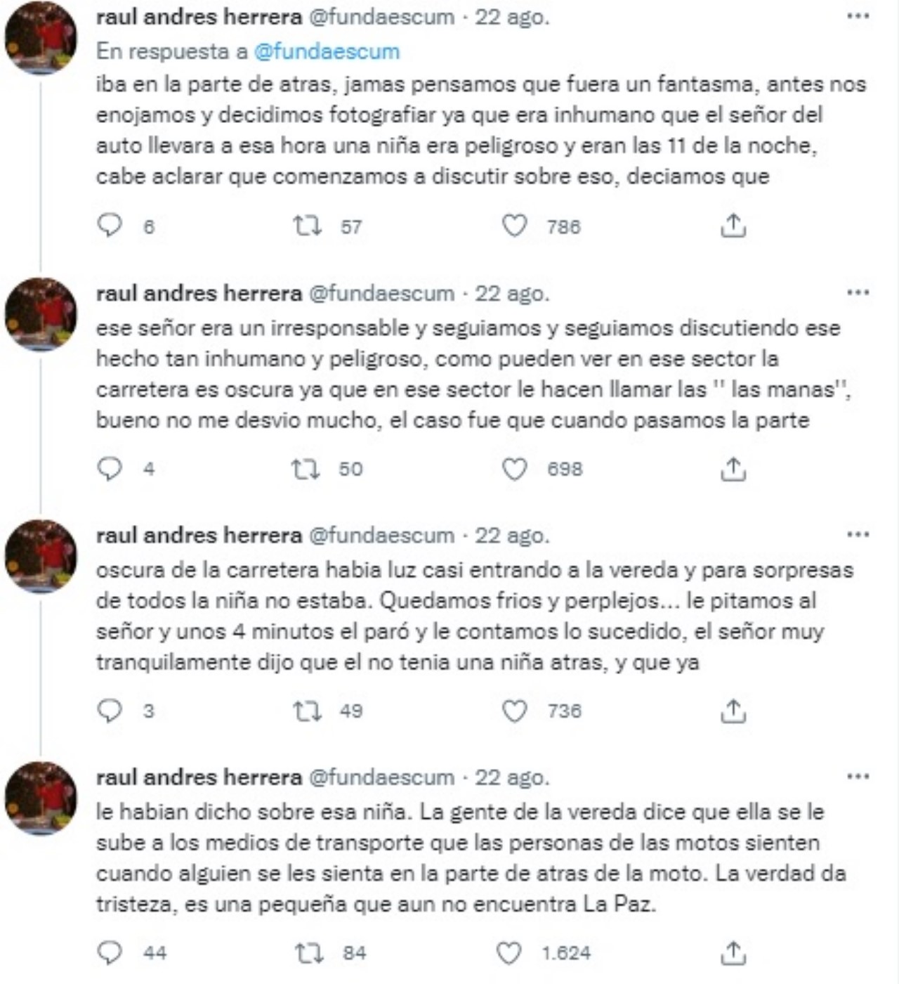 “Buenas noches, soy una persona del común que nunca había creído en seres o espíritus pero una noche en el departamento del Tolima, en camino de ida para una vereda (pueblito o caserío del campo) íbamos mi familia en el auto, y de una trocha adjunta a la carretera salió este camión y notamos que una niña”, escribió en Twitter la persona que captó la supuesta ‘niña fantasma’.