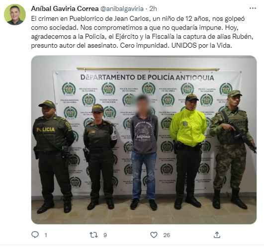 La captura fue confirmada por Aníbal Gaviria, Gobernador de Antioquia, quien manifestó, “El crimen en Pueblorrico de Jean Carlos, un niño de 12 años, nos golpeó como sociedad. Nos comprometimos a que no quedaría impune. Hoy, agradecemos a la Policía, el Ejército y la Fiscalía la captura de alias Rubén, presunto autor del asesinato”.