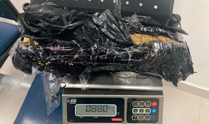 Según los uniformados el sujeto “utilizó un método de ocultamiento envolviendo su pierna con una venda, papel chicle y yeso, en la cual transportaba 880 gramos de marihuana”.