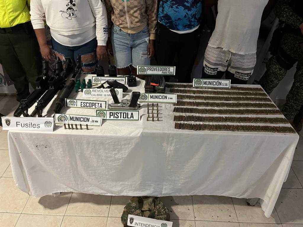 Al momento de la captura fueron incautados dos fusiles, un revólver, una pistola, una escopeta, siete proveedores para fusil, un proveedor para pistola, 537 cartuchos de diferentes calibres, dos equipos de comunicaciones y un uniforme camuflado de uso privativo de las Fuerzas Militares.