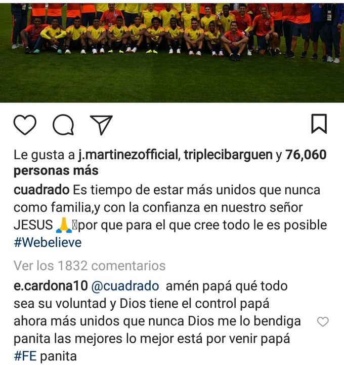 Al respecto, Cuadrado dijo que: “Es tiempo de estar más unidos que nunca como familia,y con la confianza en nuestro señor JESUS 🙏🏾por que para el que cree todo le es posible #Webelieve”.