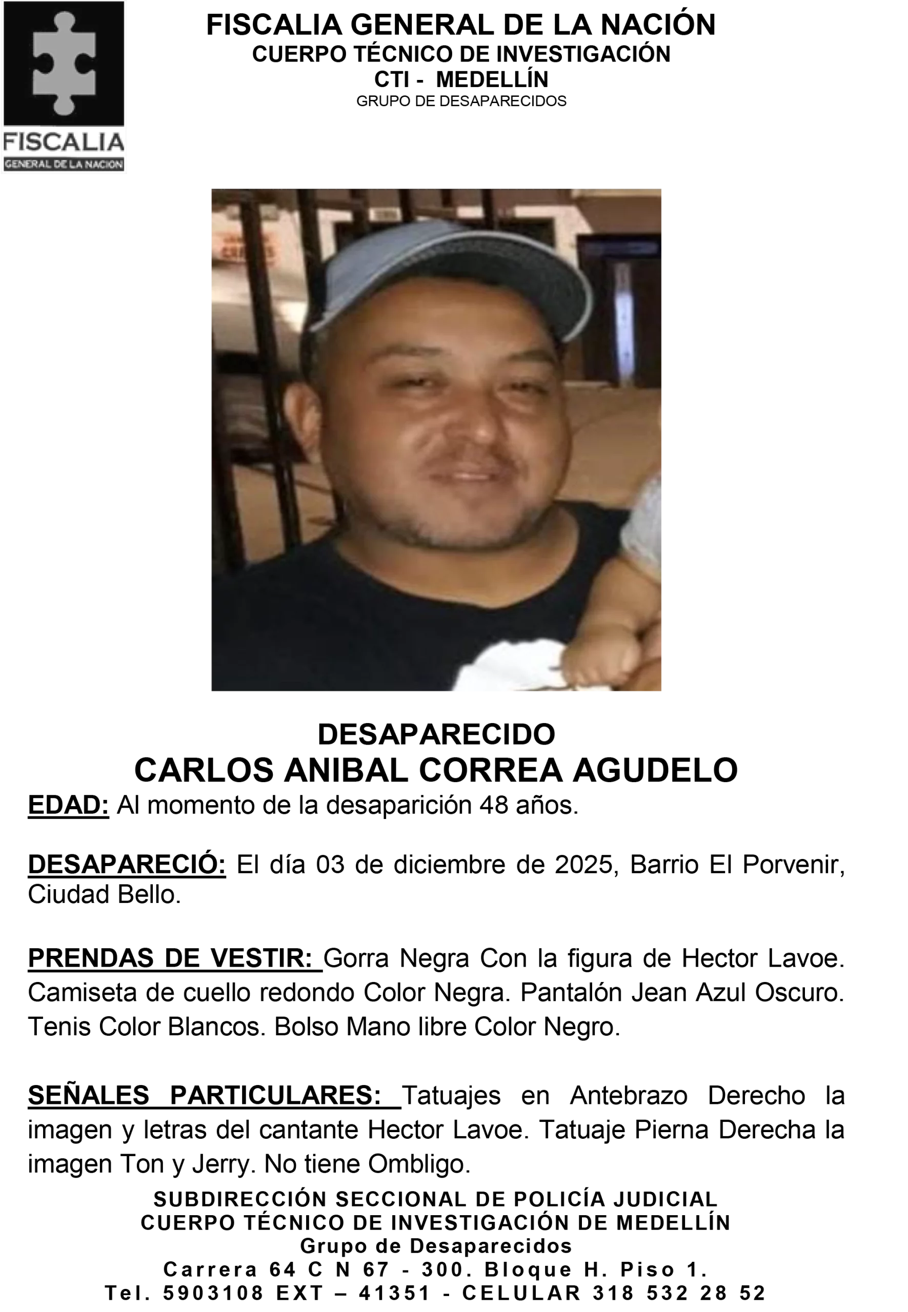 Carlos Aníbal Correa Agudelo, de 48 años, desapareció el 3 de diciembre de 2025 en el barrio El Porvenir, en la ciudad de Bello. Al momento de su desaparición llevaba puesta una gorra negra con la figura de Héctor Lavoe, una camiseta negra de cuello redondo, un pantalón jean azul oscuro, tenis blancos y un bolso manos libres de color negro.
