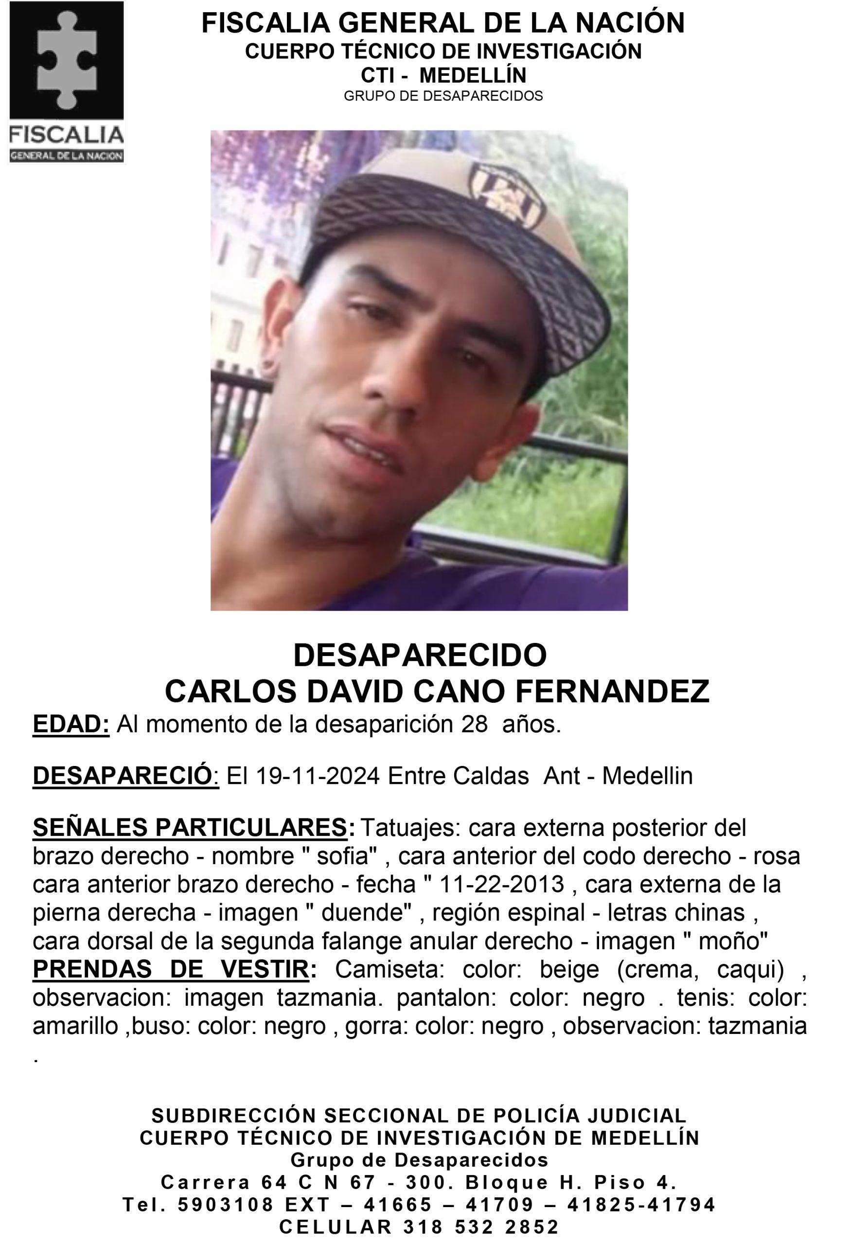 Resumen: Carlos David Cano Fernández, de 28 años, desapareció el 19 de noviembre de 2024, entre los municipios de Caldas y Medellín, en Antioquia.