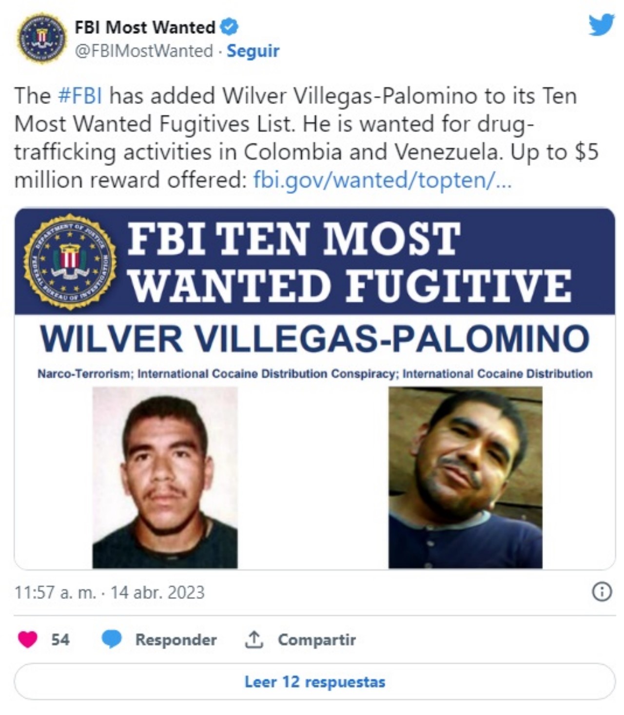 “Villegas-Palomino, alias ‘Carlos El Puerco’ pasó a ser uno de los diez fugitivos más buscados del FBI por su supuesta participación en narcoterrorismo y actividades de tráfico de drogas”, detalló en un comunicado la Oficina Federal de Investigación estadounidense.