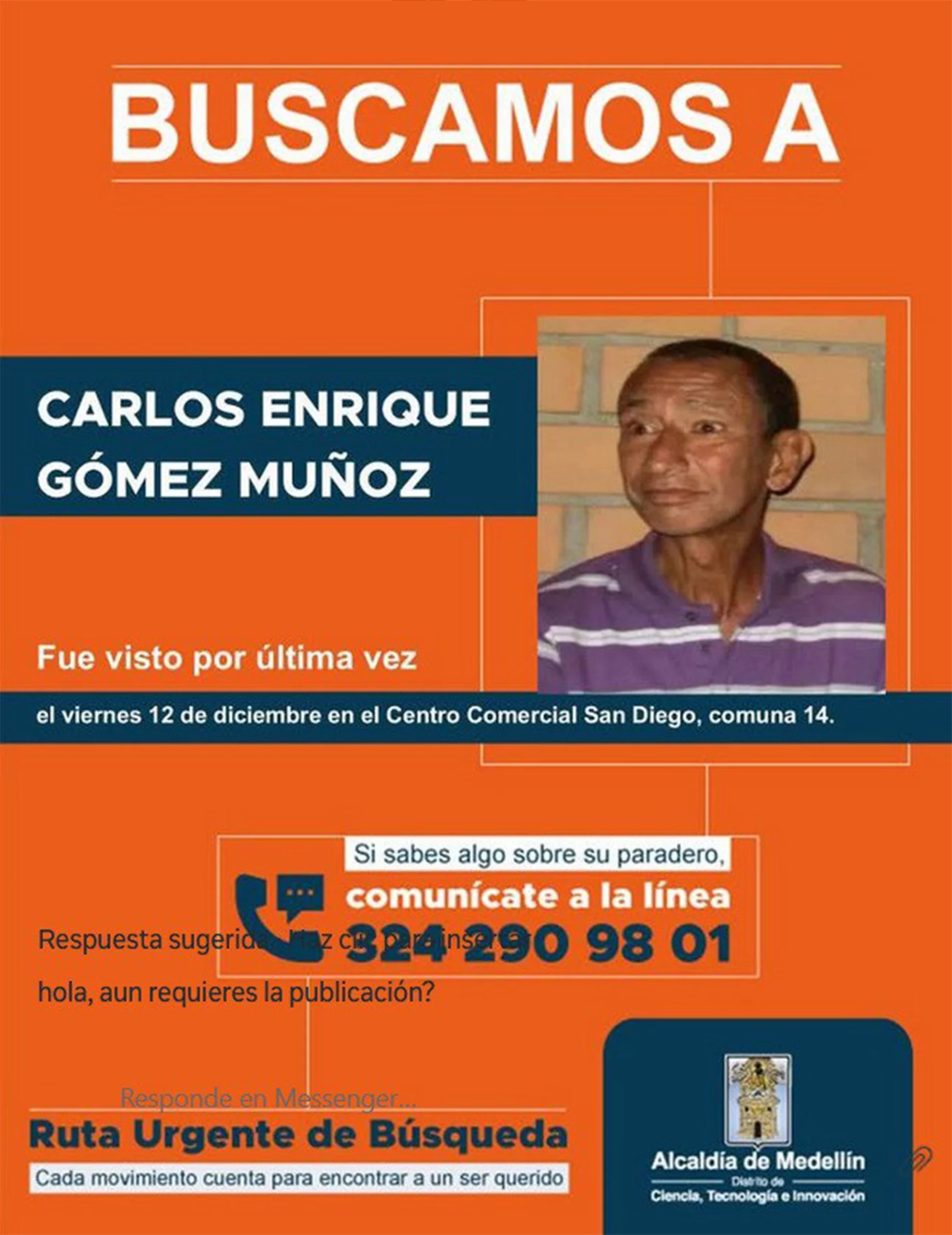Resumen: Carlos Enrique Gómez Muñoz fue visto por última vez el viernes 12 de diciembre en el centro comercial Sandiego, ubicado en la comuna 14.