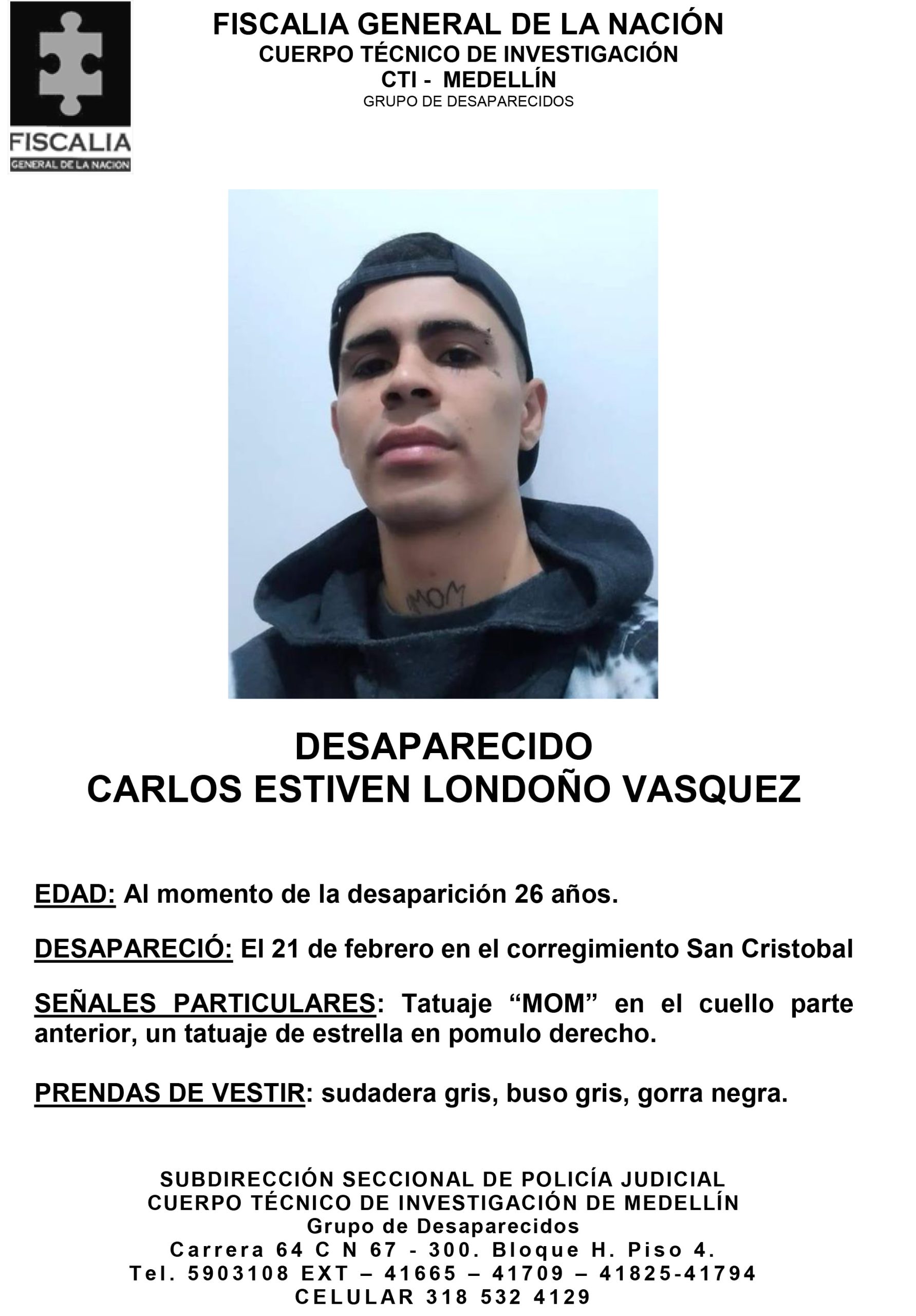 Carlos Estiven Londoño Vásquez, de 26 años, desapareció el 21 de febrero en el corregimiento San Cristóbal.