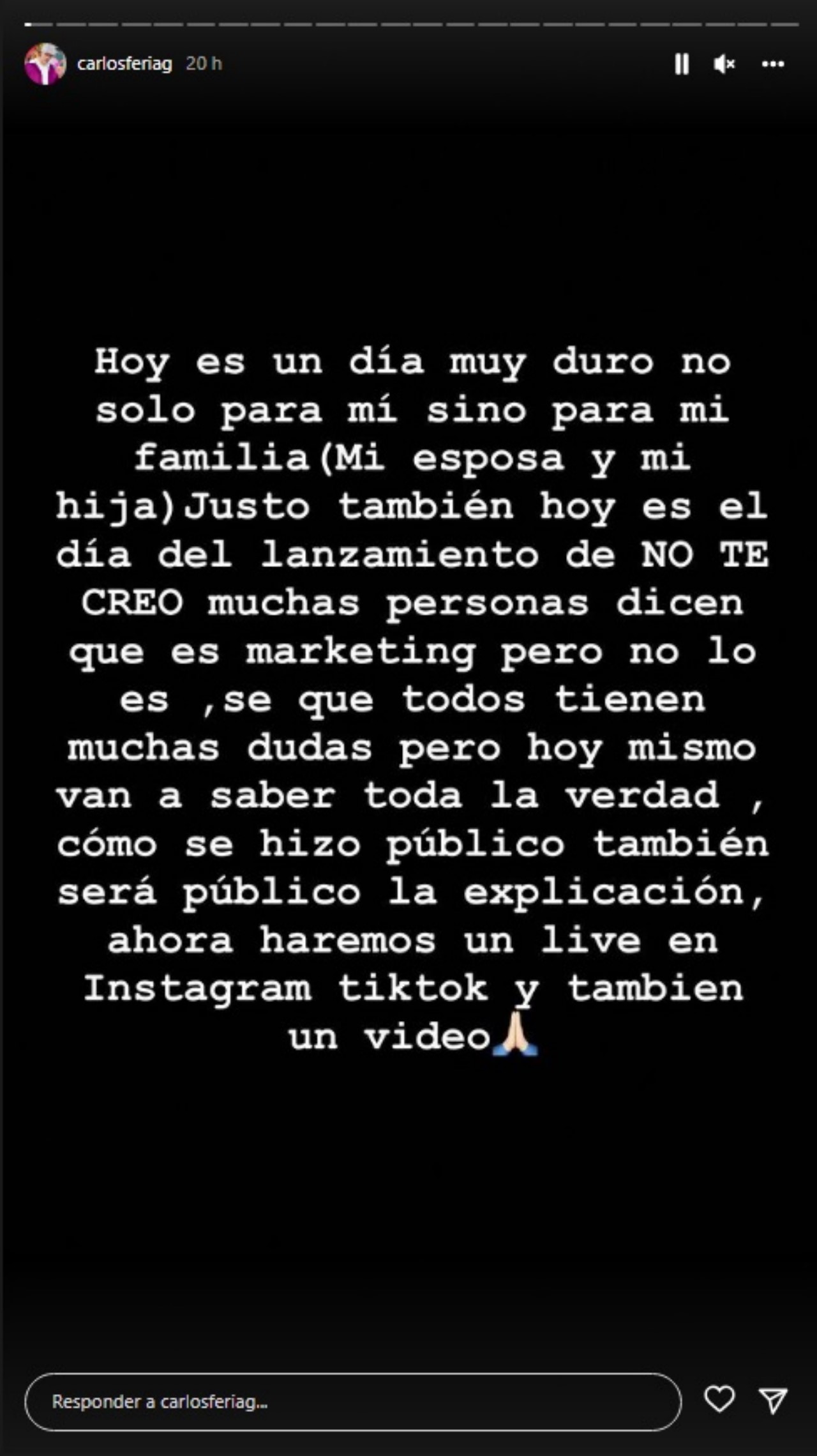 “Hoy es un día muy duro no solo para mí sino para mi familia (Mi esposa y mi hija) Justo también hoy es el día del lanzamiento de NO TE CREO muchas personas dicen que es marketing pero no lo es, sé que todos tienen muchas dudas pero hoy mismo van a saber toda la verdad cómo se hizo público también será público la explicación, ahora haremos un live en Instagram tiktok y también un video”, dijo Carlos Feria.